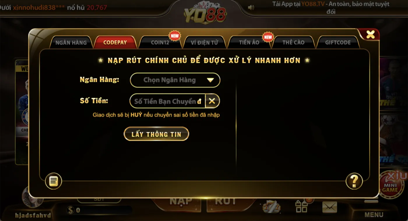 - Chuyển khoản ngân hàng: Sử dụng Internet Banking hoặc Mobile Banking để chuyển tiền vào tài khoản ngân hàng của Yo88.