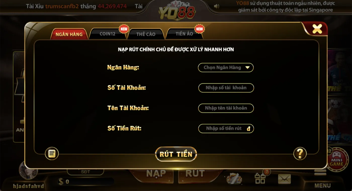 - Lựa chọn phương thức rút tiền: Yo88 hỗ trợ nhiều phương thức rút tiền khác nhau, bao gồm: